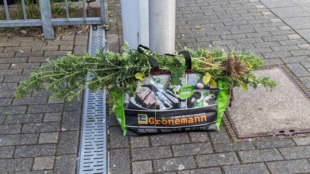 Wenn mehr Menschen mitmachen würden, wäre es (verglichen mit dem japanischen Riesenknötterich oder der Herkulesstaude des Todes) ein leichtes, das JKK loszuwerden. Es blüht nämlich erst im zweiten Jahr so ab Juni. Und es lässt sich weitgehend ohne Hilfsmittel ausrupfen. Wer es gründlich tun will, ist mit einem handelsüblichen Unkrautstecher gut ausgerüstet. Bei meinen zwei Zügen auf städtischem Boden hatte ich sogar das Gefühl, dass es sich umso besser ausreißen ließ, je höher es gewachsen war – die Blattrosetten des ersten Jahrgangs haben zu wenig anzufassen. … Ach, anfassen: um eventuelle Kontaktallergien zu vermeiden, solltest du Handschuhe tragen und vielleicht auch lange Ärmel. Wie gesagt, das Biest ist giftig.
